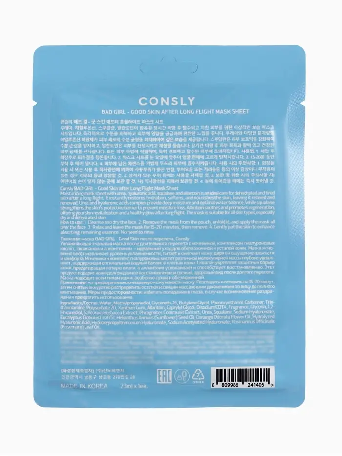Тканевая маска Consly «После длительного перелета» разработана для интенсивного увлажнения и восстановления кожи лица после длительных перелётов, переутомления, воздействия сухого воздуха в салоне самолёта или других внешних стресс‑факторов. Средство помогает вернуть коже комфорт, свежесть и ощущение гидратации за одну процедуру.