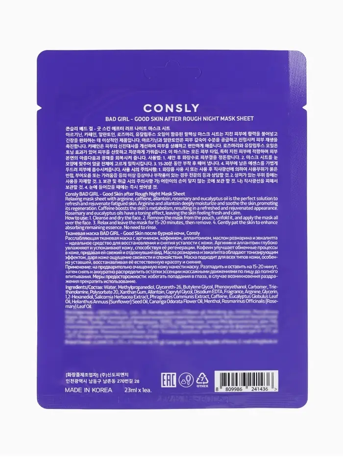Тканевая маска Consly «Восстановление и снятие усталости с кожи» предназначена для интенсивного ухода за уставшей, напряжённой и потерявшей тонус кожей. Это средство помогает быстро снять признаки усталости, восстановить естественное сияние и вернуть коже ощущение комфорта после стресса, тяжёлого дня или длительного воздействия внешних факторов. Маска входит в серию Bad Girl Good Skin, созданную для решения конкретных проблем кожи, связанных с переутомлением и снижением жизненной энергии.