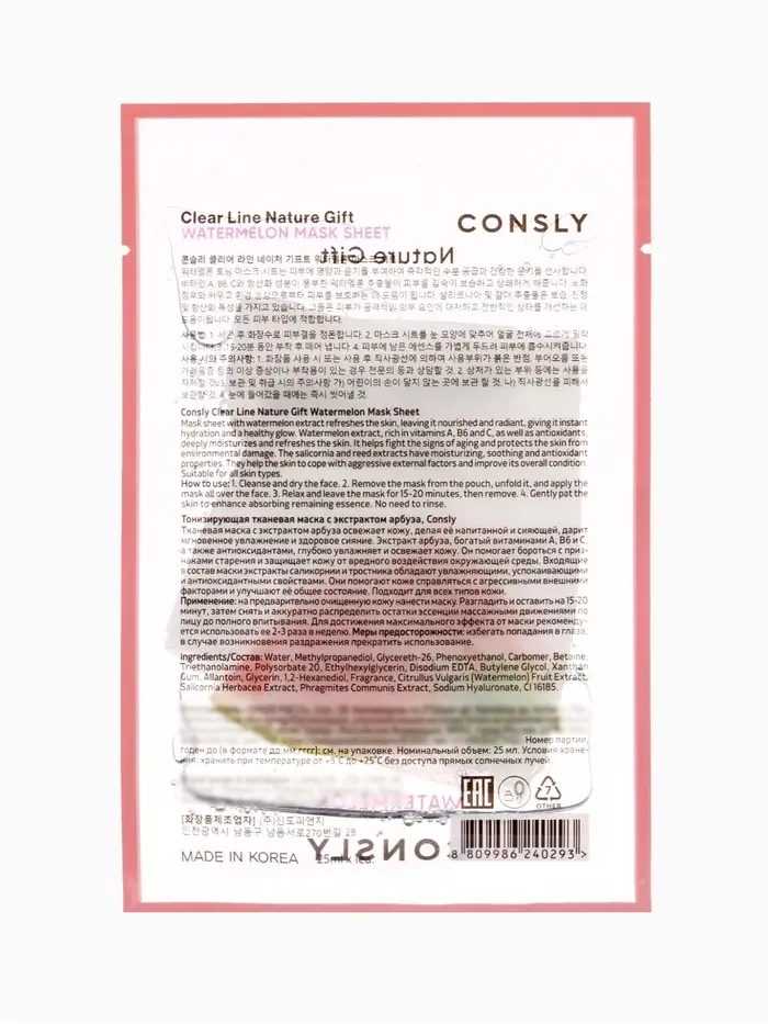 Тканевая маска Consly с экстрактом арбуза создана для интенсивного увлажнения, питания и освежения кожи лица. Экстракт арбуза богат витаминами (A, B6, C) и антиоксидантами, которые помогают насыщать кожу влагой, укреплять её защитный барьер и придавать здоровый, сияющий вид. Экстракт арбуза также помогает бороться с признаками усталости и тусклости кожи, делая её более мягкой и ухоженной. Сочетание активных компонентов обеспечивает глубокое увлажнение и улучшение общего состояния кожи, а дополнительные растительные экстракты обладают успокаивающим и антиоксидантным действием.