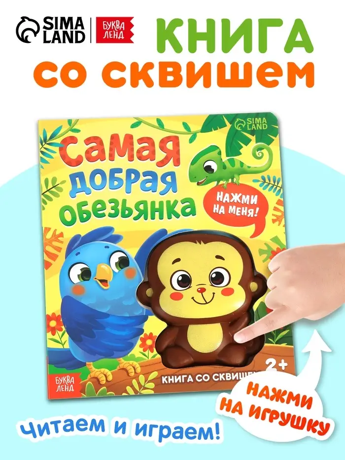 Книга со сквишем "Самая добрая обезьянка. Нажми на меня!"
