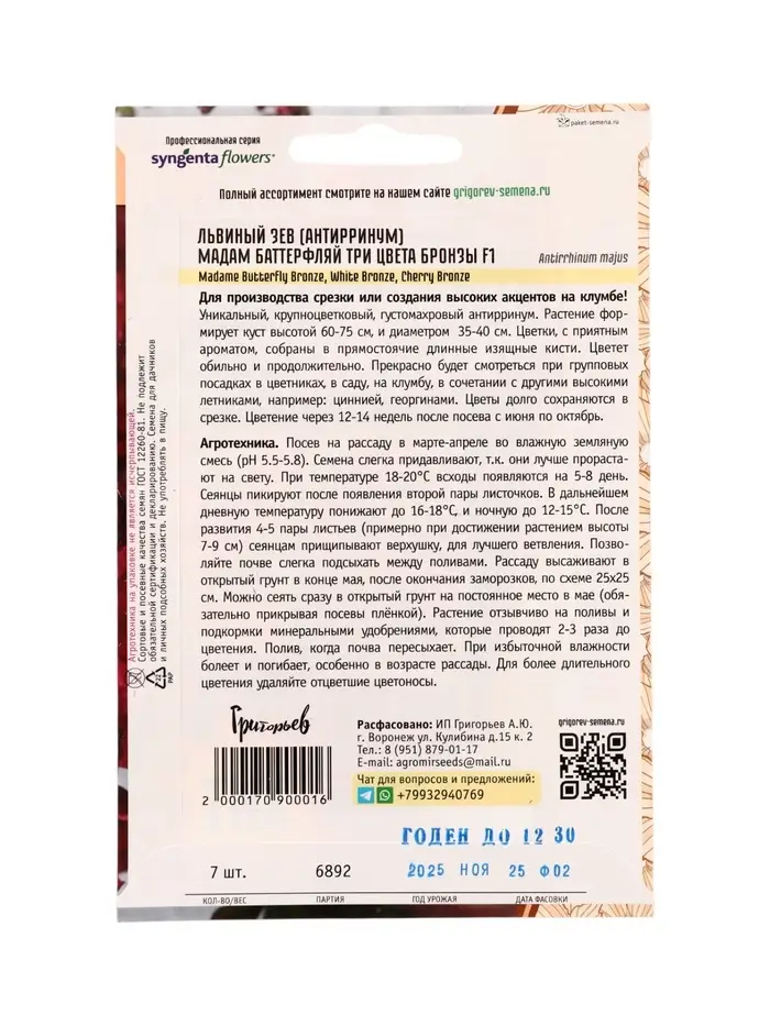 Семена цветов Львиный Зев Мадам Баттерфляй Три Цвета Бронзы (Madame Butterfly Bronze, White Bronze,