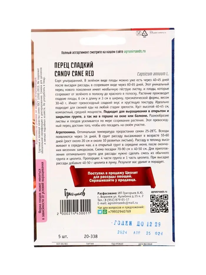 Семена Перец сладкий Карамельная Трость Красная (Candy Cane Red) 5шт. 12.29 г.