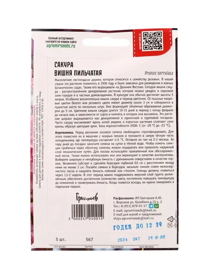Семена цветов Сакура Вишня мелкопильчатая 5шт. / НОВИНКА 12.29 г.