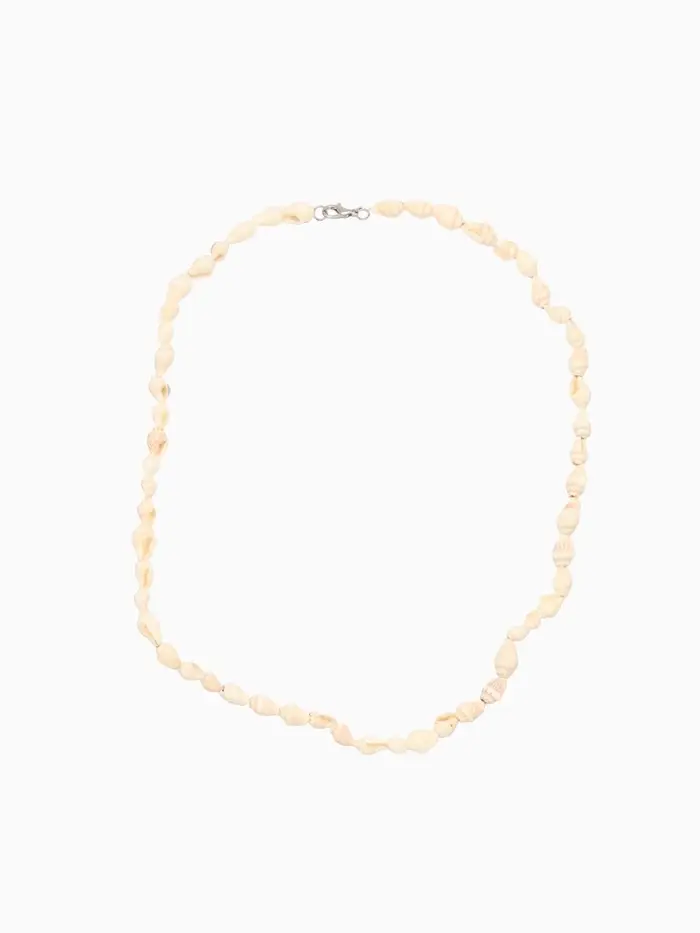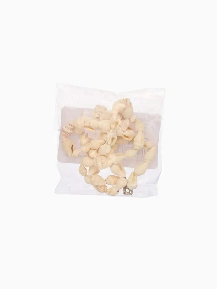 Украшением колье служит крупная натуральная белая ракушка, чья причудливая форма и изящные очертания напоминают о бесконечных прогулках вдоль пляжа и тихом плеске прибоя. Фон колье соткан из нежных нитей текстильного полотна, которые повторяют ритм песчаных берегов и кажутся почти невесомыми на шее.