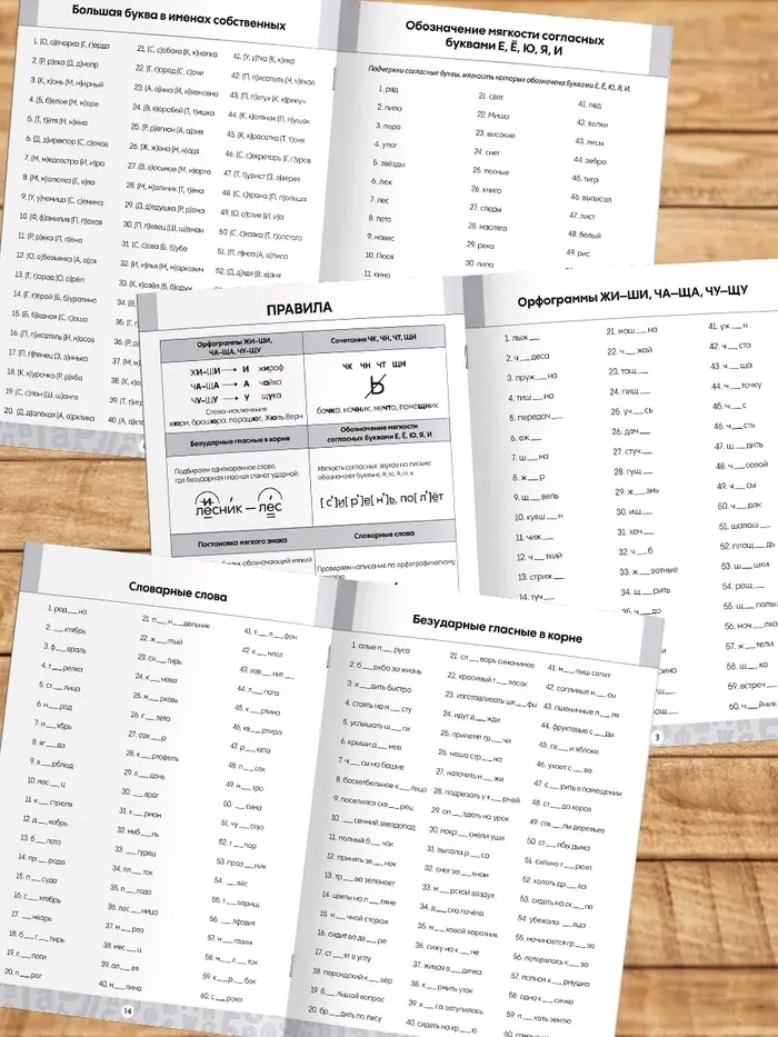 - 20 страниц с заданиями на усвоение правил: «жи-ши», «ча-ша», «чу-щу», «чк, чн, чт», «большая буква в именах собственных», «мягкий знак», «безударная гласная в корне слова» и другие.