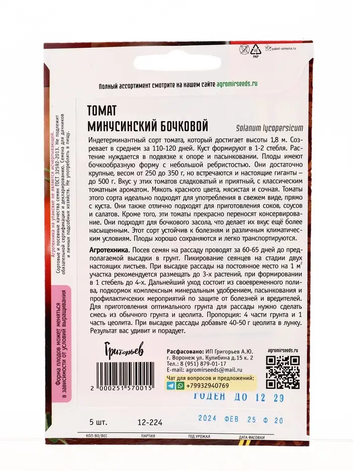 Семена Томат Минусинский Бочковой 5шт. 12.29 г.