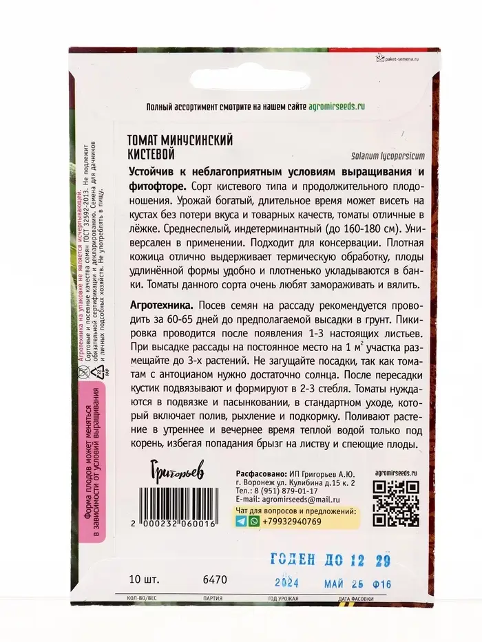 Семена Томат Минусинский Кистевой 10шт. 12.29 г.