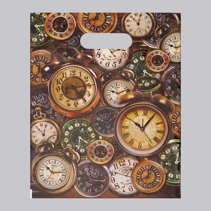 Стильная упаковка для подарков с тематикой времени! Подарочный пакет «Часы» с вырубной ручкой — это универсальная упаковка для презентов и покупок. Пакет сочетает практичность и привлекательный дизайн, подчеркивая внимание к деталям.