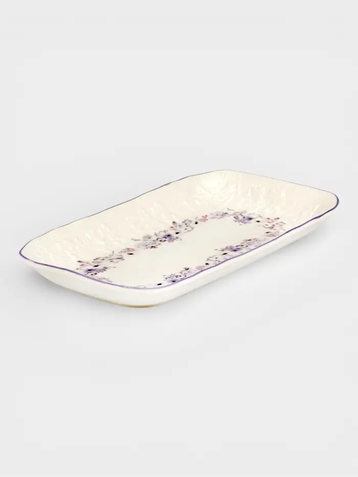 Сервировочное блюдо «Purple Gardens» — элегантный способ подать закуски, выпечку или фрукты с намёком на весенний сад. Прямоугольная форма (25×14 см) удобно размещается на любом столе, а белый фарфор с цветочно-растительным деколем добавляет сервировке утончённости без вычурности. Лёгкий рельеф подчёркивает узор, делая изделие живым на ощупь и взгляде.