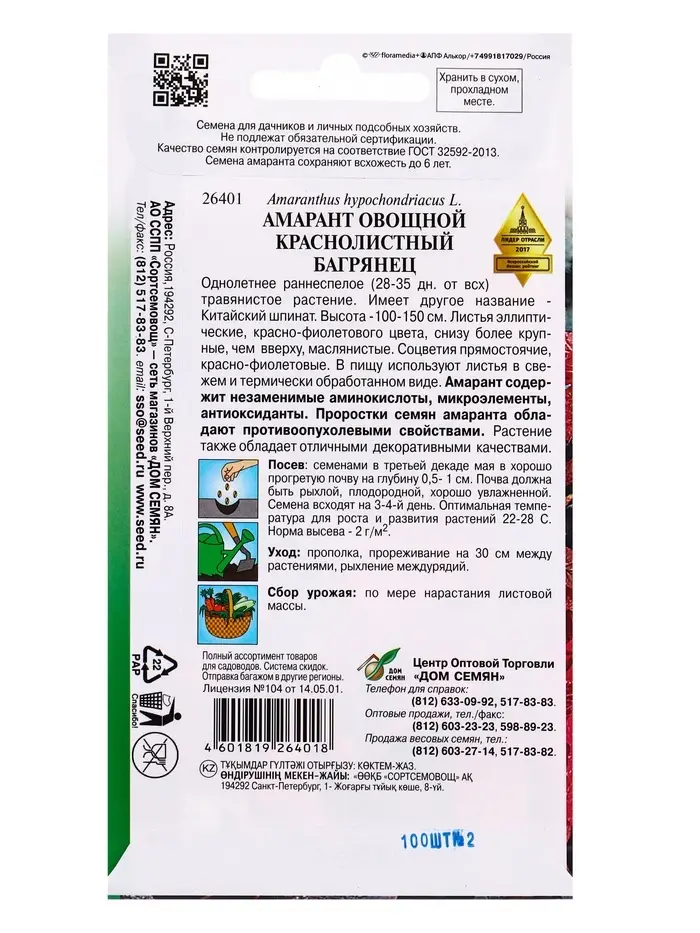 Семена Амарант овощной краснолистный Багрянец 100 шт