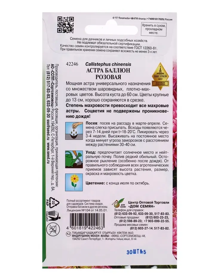 Семена цветов Астра Баллюн розовая 30 шт