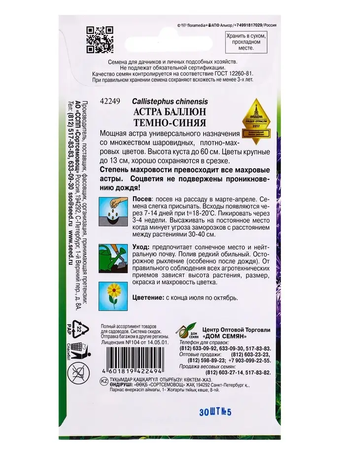 Семена цветов Астра Баллюн тёмно-синяя 30 шт