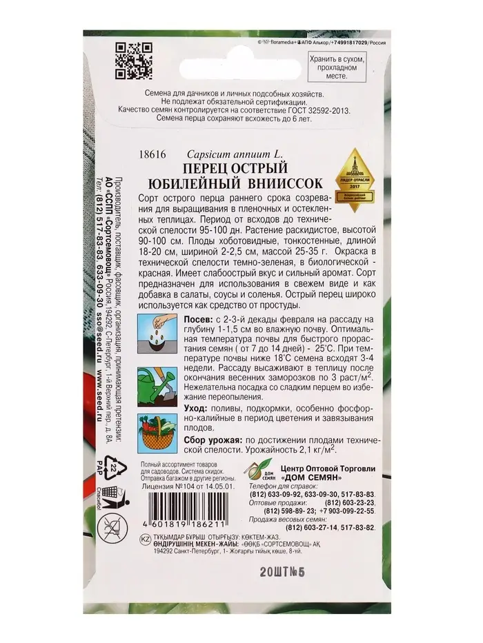 Семена Перец острый ЮбилейныйВНИИСОК 20 шт