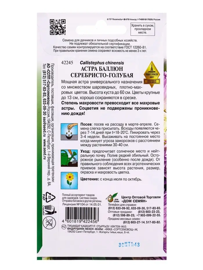 Семена цветов Астра Баллюн серебристо-голубая 30 шт
