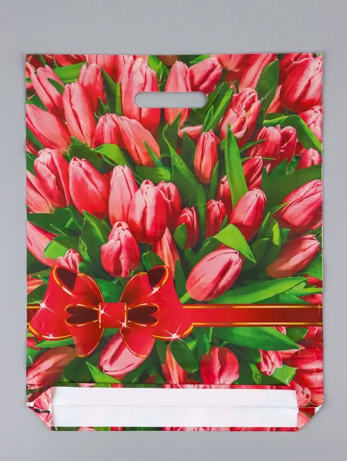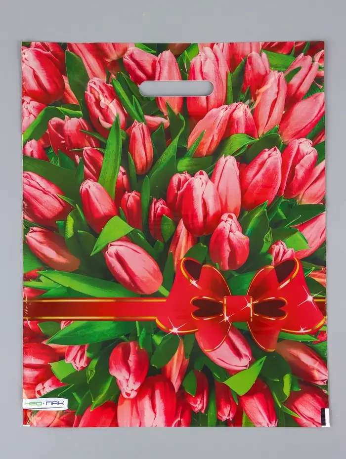 - Дизайн с иллюзией объёмного украшения: Изображение крупного атласного банта создаёт эффект, будто подарок уже перевязан лентой. Красный цвет добавляет праздничности, делая пакет уместным для 8 Марта, 14 Февраля или дня рождения.