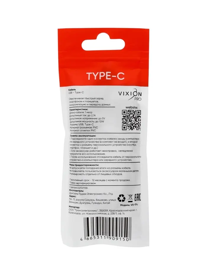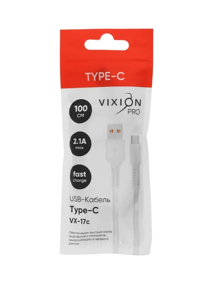Кабель VIXION PRO VX-17c, USB - Type-C, 2.1 А, 1 м, белый
