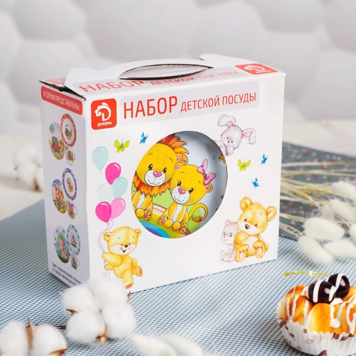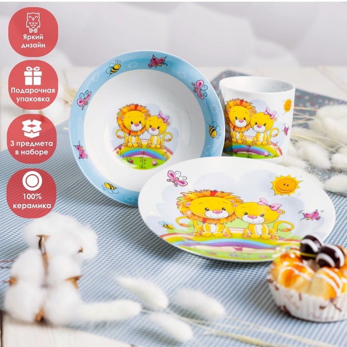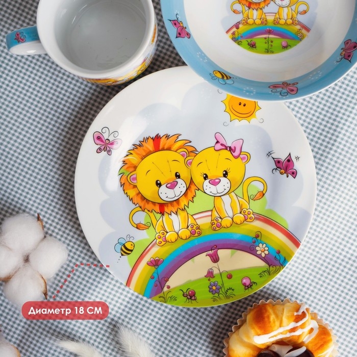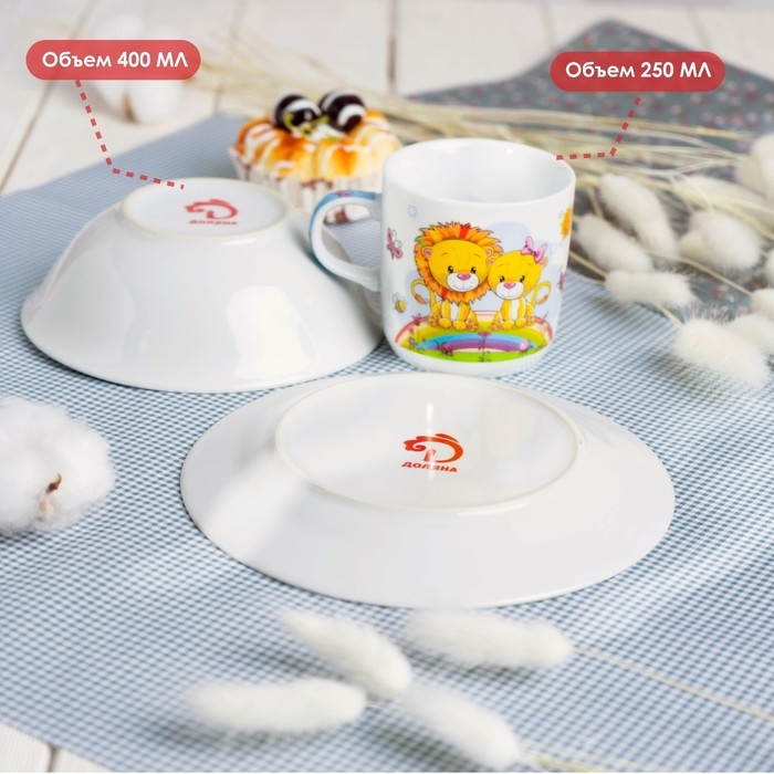 Набор детской посуды Доляна «Львята», 3 предмета: кружка 230 мл, миска 400 мл, тарелка d=18 см, цвет белый