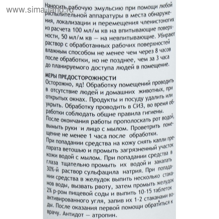 Способ применения: Для проведения обработки необходимо приготовить рабочую эмульсию путем разведения концентрата «Агран» водой комнатной температуры. Наносить рабочую эмульсию при помощи любой распылительной аппаратуры в места обнаружения, локализации и перемещения членистоногих из расчета 100 мл/м кв на впитывающие поверхности, 50 мл/м кв – на невпитывающие. Убирают средство с обработанных рабочих поверхностей влажным способом не менее чем через 8 часов после обработки, но не позднее, чем за 3 часа до планируемого доступа людей в помещение.