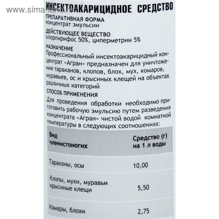 Профессиональный инсектоакарицидный концентрат «Агран» предназначен для уничтожения тараканов, клопов, блох, мух, комаров, муравьев, ос и крысиных клещей на объектах различных категорий, в том числе пищевых, лечебных, детских, коммунально-бытовых.