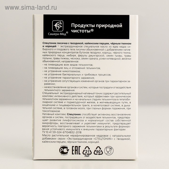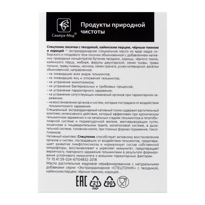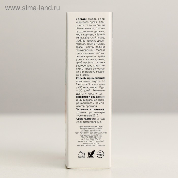 Состав: масло ядер кедрового ореха, плодовое тело лисички обыкновенной, бутоны гвоздичного дерева, кора корицы, чёрный тмин, кайенский перец, имбирь, ферула джунгарская, семена тыквы, трава и цветки полыни обыкновенной, трава и цветки пижмы, чеснок, семена граната, трава уснеи нитевидной, гриб весёлка, семена расторопши, трава мелиссы, трава володушки золотистой, медвежья желчь.