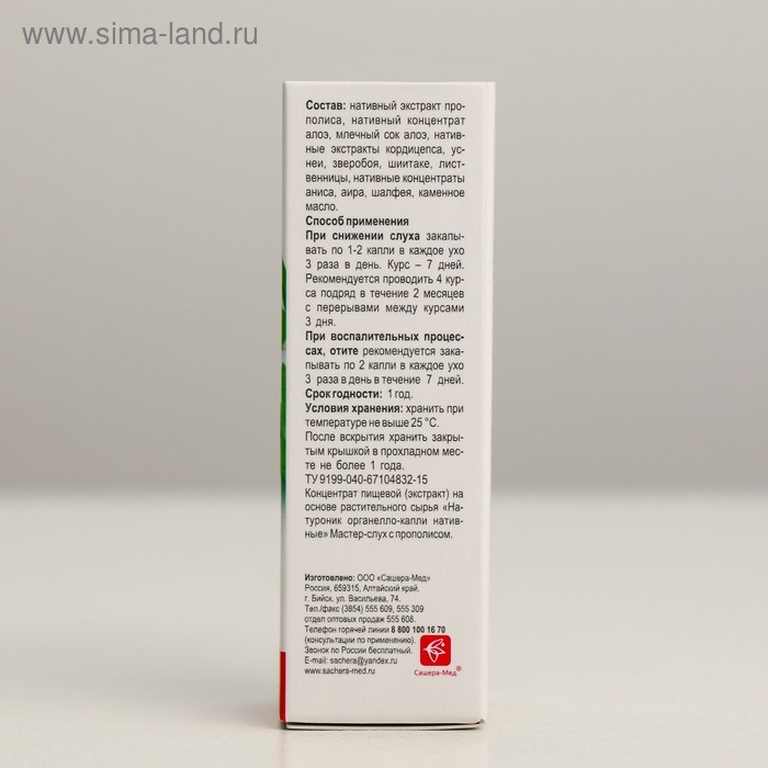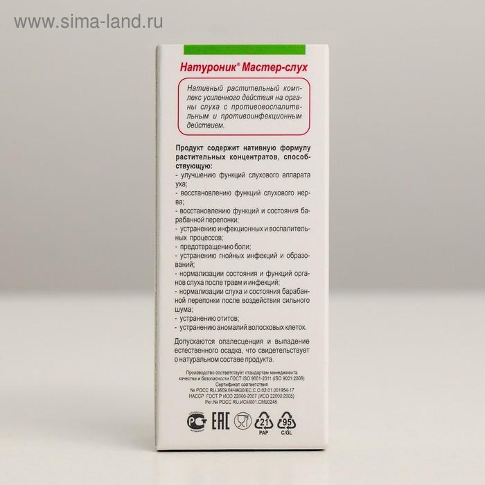 «Натуроник»® Мастер-слух с прополисом, органелло-капли – нативный растительный комплекс усиленного действия на органы слуха с противовоспалительным, антибактериальным, противоинфекционным действием. Нативные экстракты растений активизируют процессы регенерации и восстановления клеток слуховых органов при механических, травматических, нейросенсорных и инфекционных повреждениях барабанной перепонки, слухового нерва, волосковых клеток, восстанавливают кровообращение и передачу звуковых импульсов в мозг, в результате способствуют улучшению восприятия звука.