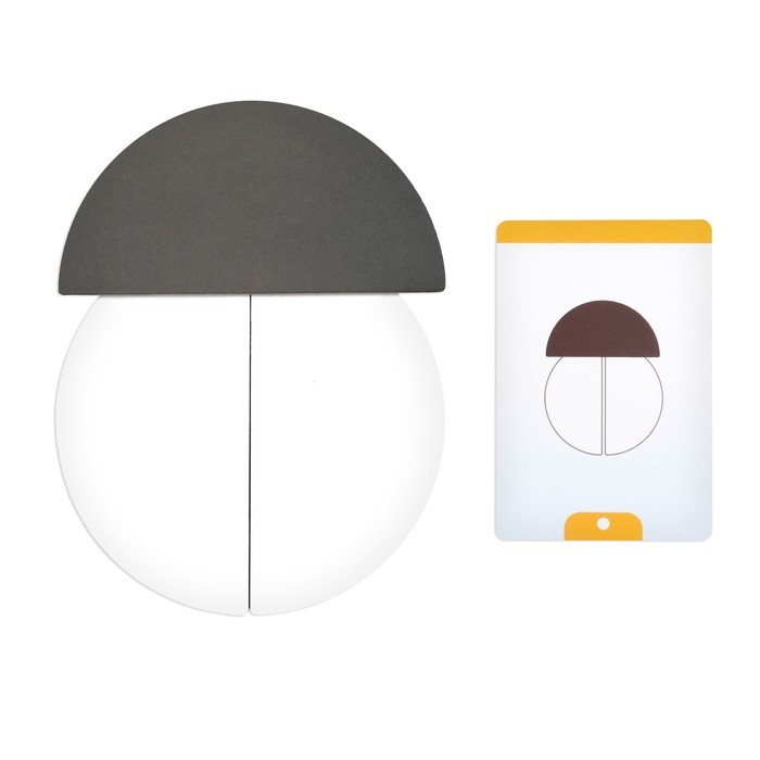 Разделите карточки по уровню сложности: 1 кружок — уровень 1-й (самый лёгкий), 2 кружка – уровень 2-й (средней сложности), 3 кружка – уровень 3-й (самый сложный). Перемешайте каждую колоду по отдельности и поместите на столе рубашкой вверх. Детали разместите на столе так, чтобы ребёнок мог до них дотянуться. Попросите малыша вытянуть верхнюю карточку из колоды и поместить перед собой. Задача — составить из деталей точно такую же картинку.