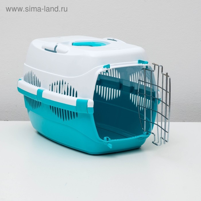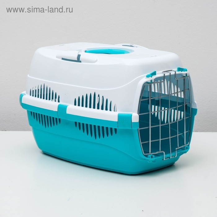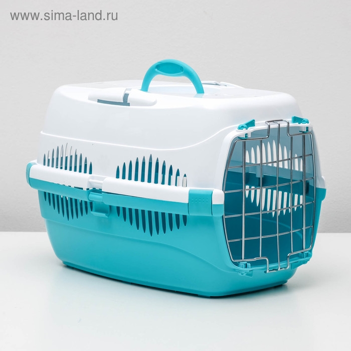 Переноска для животных до 9 кг "Пижон", металлическая дверь, 43х29х27,5 см, бело-бирюзовая