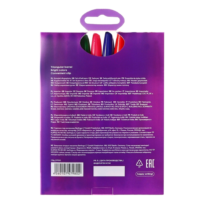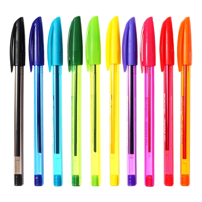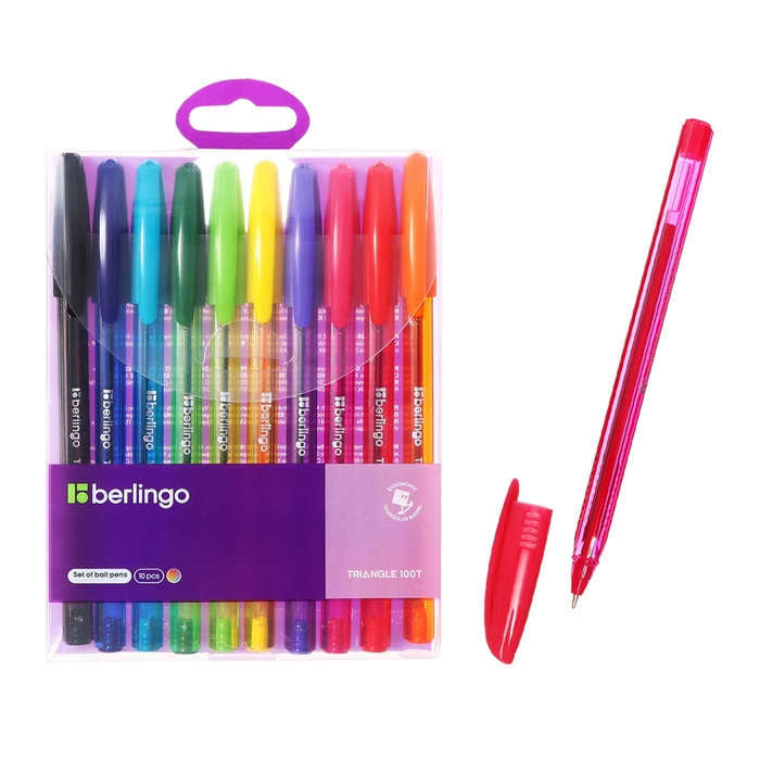Набор шариковых ручек Berlingo Triangle 100T имеет 10 ручек разных цветов: чёрный, синий, голубой, фиолетовый, зелёный, салатовый, красный, оранжевый, розовый, жёлтый. Изделие имеет технологию Smart Ink, что обеспечивает супермягкое письмо при работе. Ручка обладает прочным пластиковым клипом, который позволит изделие прикрепить на ежедневник и всегда носить с собой, а также удобный корпус трёхгранной формы. Вентилируемый колпачок защитит стержень от повреждений и не позволит испачкать личные вещи чернилами. Рифление в зоне захвата препятствует скольжению пальцев при письме, что гарантирует прочное и уверенное письмо при работе. Цвет корпуса соответствует цвету чернил. Диаметр пишущего узла 0,7 мм, благодаря чему ручка прекрасно подходит для любого стиля письма. Толщина линии письма составляет 0,5 мм, а длина линии письма - 1000 метров. Набор упакован в пластиковый пакет с европодвесом. Цвет чернил: ассорти, Толщина линии письма: 0,5 мм, Длина линии письма: 1000 м, Цвет корпуса: тонированный ассорти, Количество штук в упаковке: 10, Тип упаковки: пластиковый пакет с европодвесом.
