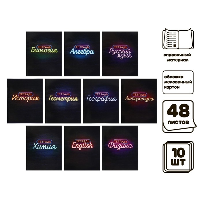 Комплект предметных тетрадей 48 листов «Неон», 10 предметов со справочным материалом, обложка мелованный картон, УФ-лак, блок офсет