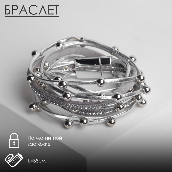 Браслет кожа «На магните» бусинки, цвет бело-серебристый, 38см