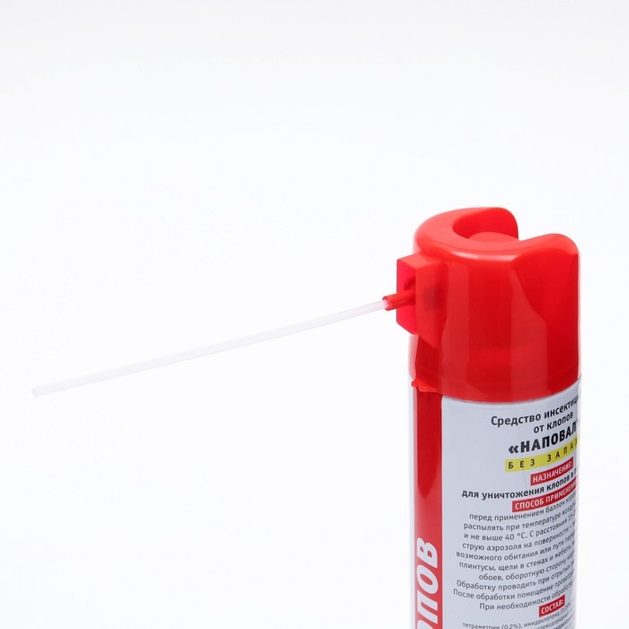 Перед применением рекомендуется очистить пораженные поверхности при помощи пылесоса. Для наилучшего распространения средства по комнате распыляйте аэрозоль вверх, ближе к центу помещения. Обработайте места скопления постельных клопов (стыки деталей в кроватях, диванах, креслах, щели в стенах, под подоконниками, в местах отставания обоев, оборотную сторону картин и ковров) с расстояния 30-50 см. Постельные принадлежности обрабатывать не следует! Через 30-60 минут после обработки тщательно проветрите помещение в течение 2-4 часов. Через 14-18 дней рекомендуется провести повторную обработку для уничтожения оставшихся клопов. Содержит в составе два сильнодействующих вещества - имидаклоприд 0,05% + тетраметрин 0,15%. После распыления аэрозоль попадет на насекомых, проникает в тело через хитиновый покров и воздействует на нервную систему. Гибель насекомого наступает через несколько часов, за это время успевает заразить своих "друзей".