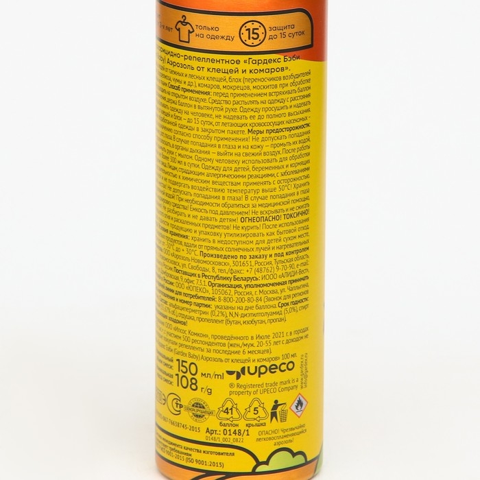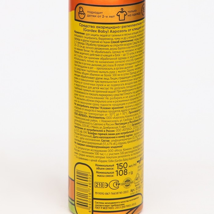 Активное вещество:Альфациперметрин - 0,2%, N,N-диэтилтолуамид - 5%, спирт этиловый денатурированный (55,2% об.), отдушка, пропеллент (бутан, изобутан, пропан).Описание:Аэрозоль от клещей и комаров Gardex Baby - ваше спасение в сезон активности насекомых! Средство работает и от клещей, и от комаров, а значит, ваш ребенок будет полностью под защитой Gardex.Аэрозоль от комаров и клещей Gardex Baby тщательно протестирован. Парализованный клещ отпадает от обработанной одежды через 2-3 минуты, не успевая прицепиться к телу. Испытания проводили ведущие специалисты – энтомологи страны в главных научных центрах России. Эффективность подтверждена НИИ Дезинфектологии Роспотребнадзора.Помните, клещи живут в траве. На прогулке ножки и ручки ребенка должны обязательно быть закрыты одеждой. Тщательно обрабатывайте, штанишки, курточку, рукава. Средство нужно наносить заранее, чтобы одежда успевала высохнуть до прогулки. Перед применением встряхивать баллон 2-3 секунды. Обработку проводить на открытом воздухе. Средство распылять на одежду с расстояния 20-25 см до легкого увлажнения, держа баллон в вытянутой руке. Одежду просушить и надевать на нижнее белье. Не обрабатывать одежду на человеке, не надевать ее до полного высыхания. Время защитного действия от клещей и блох – до 15 суток, от летающих кровососущих насекомых – до 5 суток, при хранении обработанной одежды в закрытом пакете.