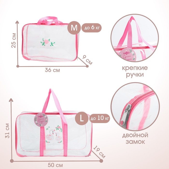 Сумка в роддом с косметичкой «Лебеди», набор 2 шт., 50х31/36х25, цвет прозрачный/розовый, Mum&Baby