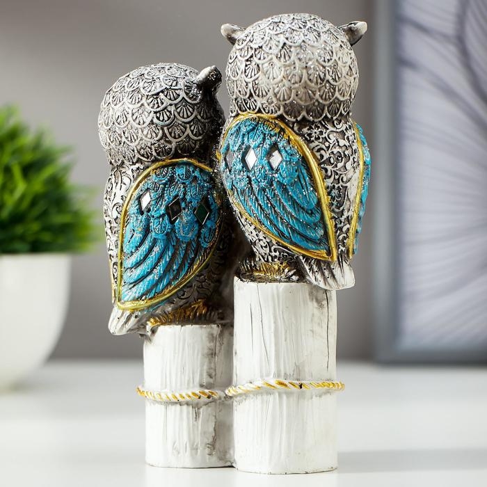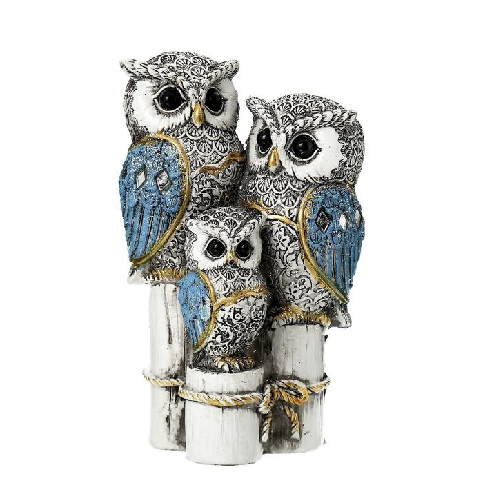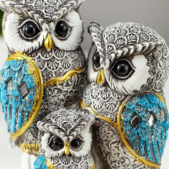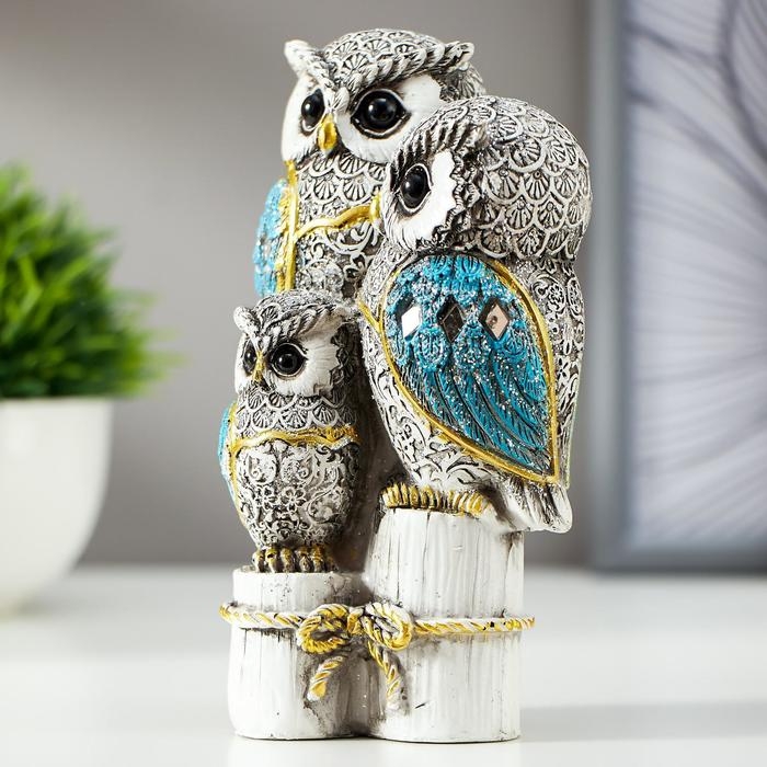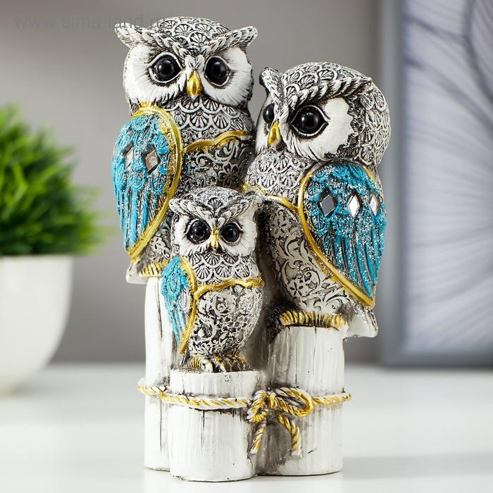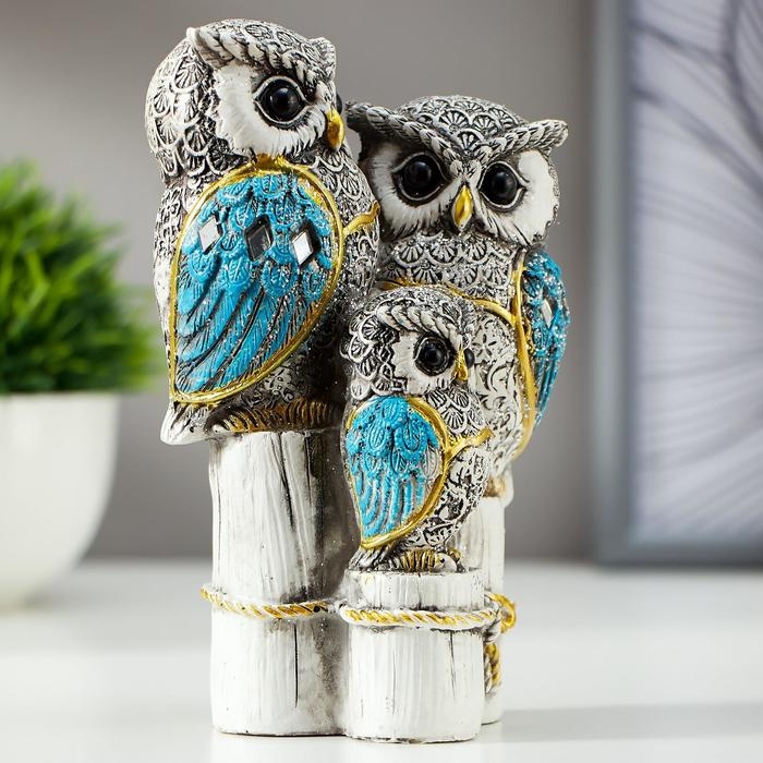 Сувенир полистоун "Семейство серых филинов с синими крыльями, на пеньках" 14,5х8,5х5,5 см