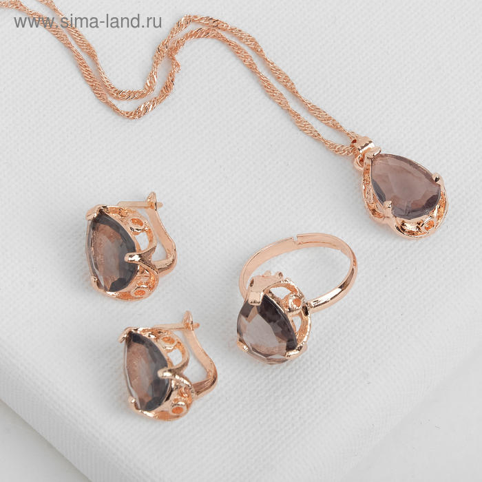 Гарнитур 3 предмета: серьги, кулон, кольцо безразмерное «Эдель» капля, цвет серый в золоте, 45см