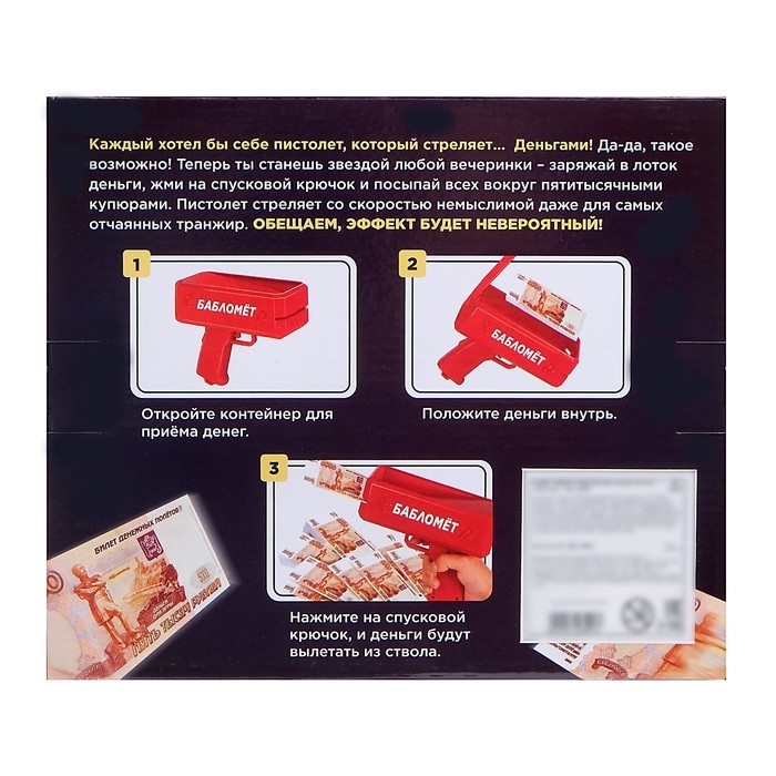 Пистолет «Бабломёт» стреляет купюрами, создавая эффект денежного дождя! Чтобы начать игру, поместите банкноты в отсек сверху и нажмите на спусковой крючок.