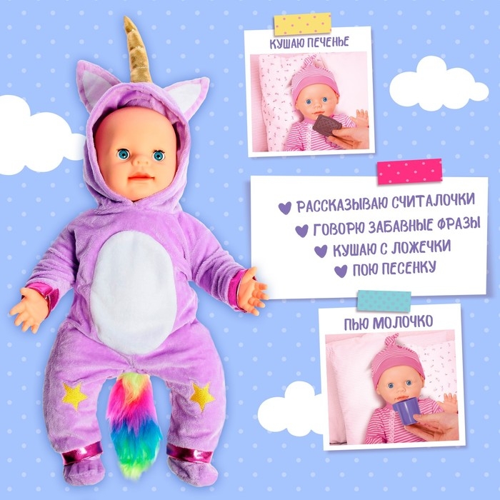 - Пупс ест с ложечки (причмокивает), пьёт (имитация, реагирует на кружечку), ест печенье (звук откусывания, если поднести печенье).