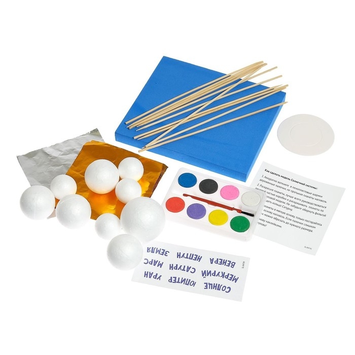 В наборе: пенопластовые шары, палочка, нитки, краски, кисточка, фольга, наклейки, буклет.