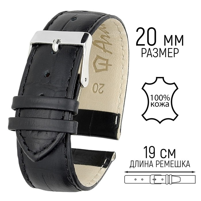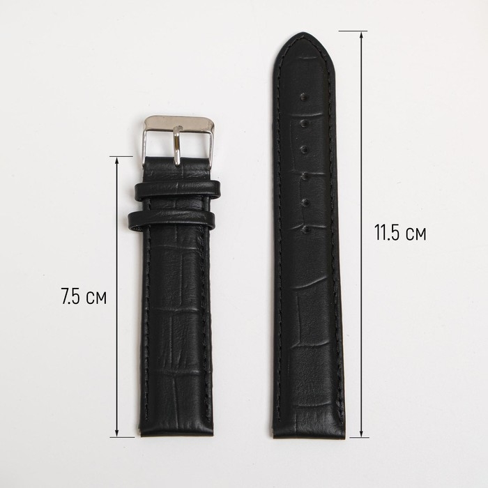 Ремешок для часов, мужской, 20 мм, запряжник 75 мм, горт 115 мм, натуральная кожа, чёрный