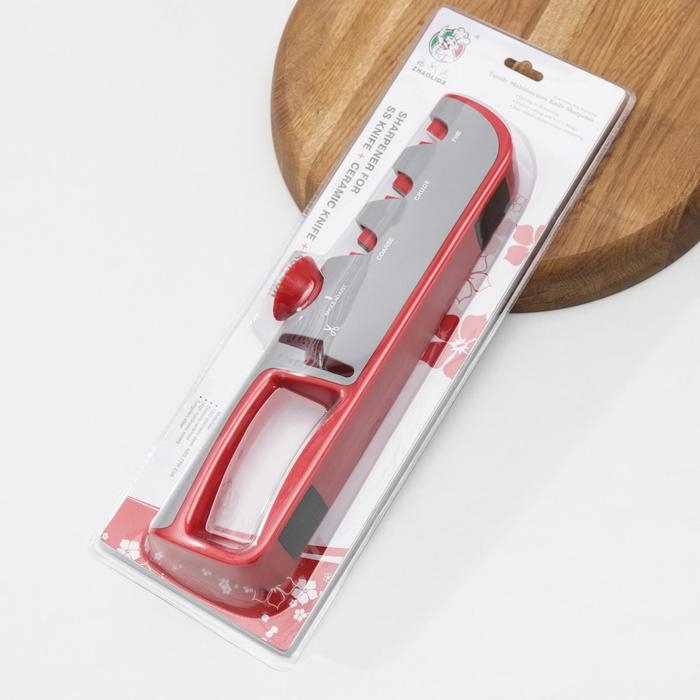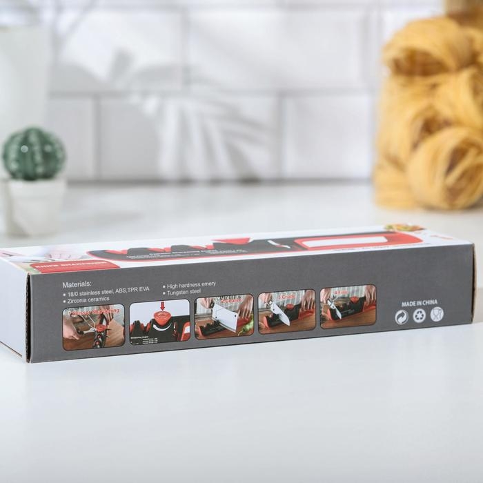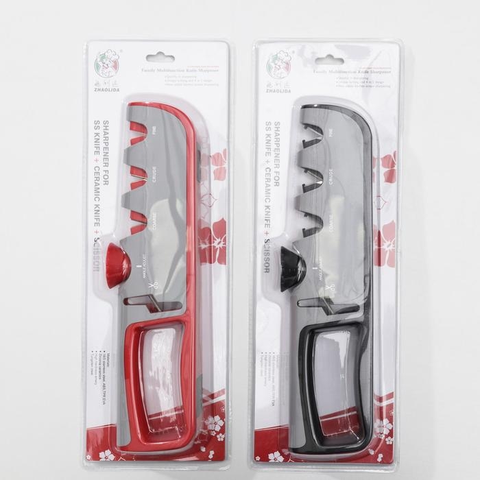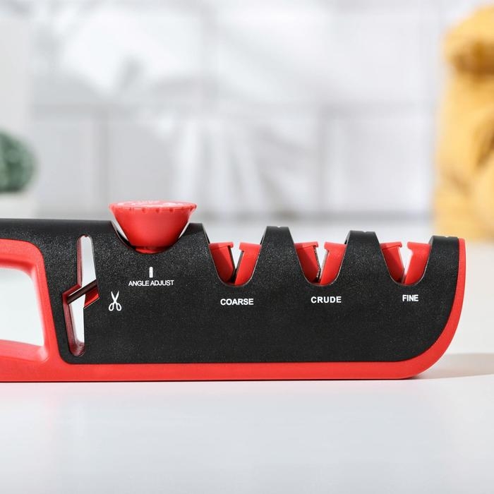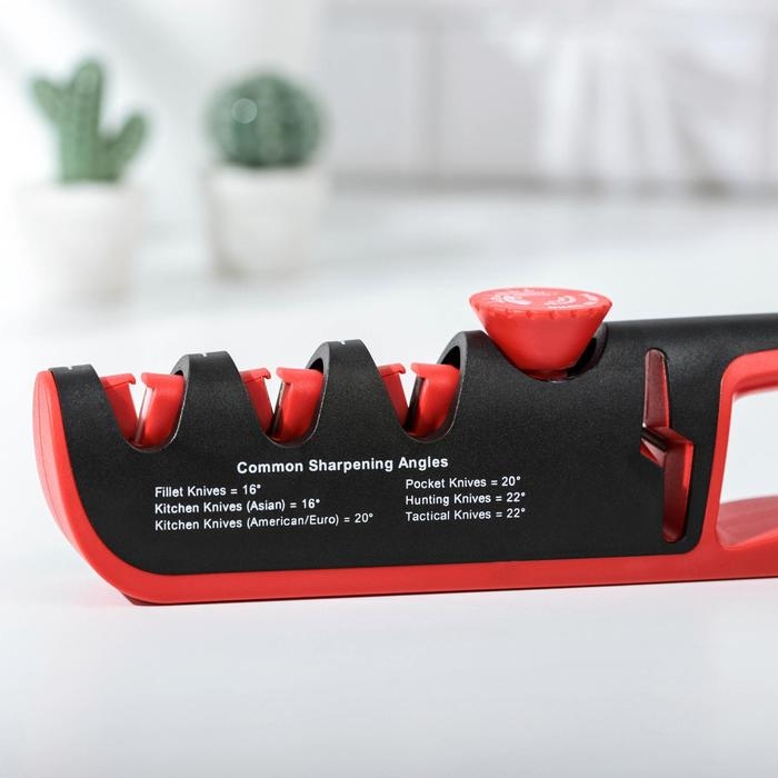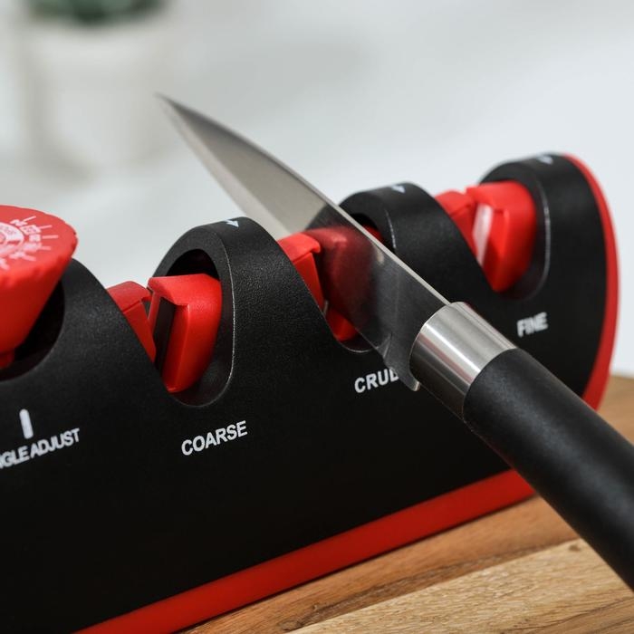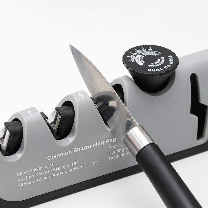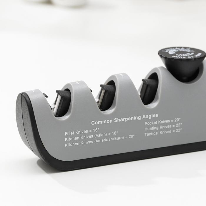 Точилка для ножей выполнена из высококачественных материалов. Она имеет 3 слота для заточки и правки ножей, а также нескользящее основание.