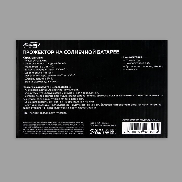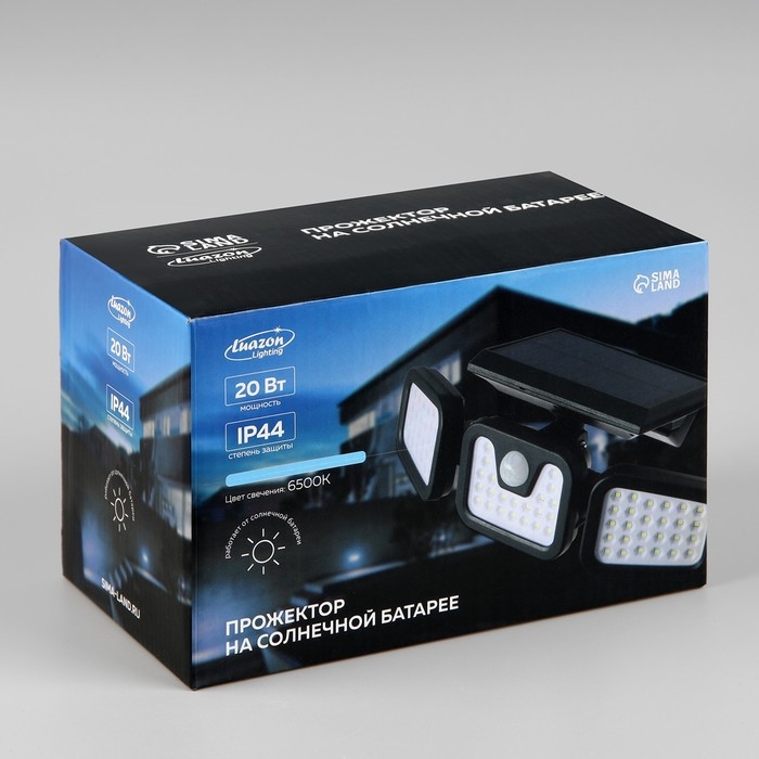 Светодиодный прожектор на солнечной батарее 20 Вт, выносная панель, 15 × 13 × 7 см, 6500К