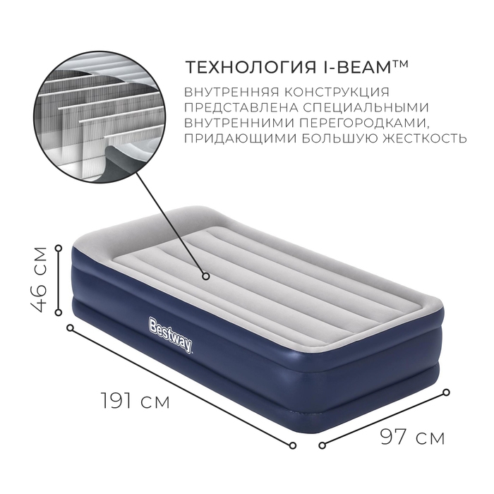 - Модель имеет встроенный электрический насос для быстрого надувания и сдувания кровати.