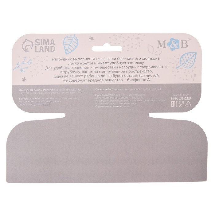 Товар изготовлен из силикона, не содержащего токсичных веществ. После использования мойте тёплой мыльной водой. Нагрудник рекомендован для детей старше 4 месяцев.