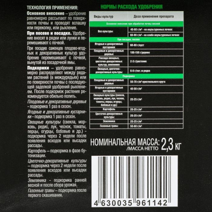 Удобрение содержит основные элементы питания в легкоусвояемой форме и сбалансированном соотношении, способствует хорошему росту растений и получению высокого урожая.