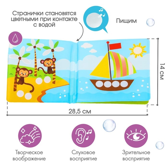 Красивая, яркая книжка предназначена для игры в ванной комнате, малышу будет очень весело разрисовывать книжку пальчиками, от контакта с водой книжка окрашивается разными цветами, после высыхания возвращается в первичное состояние. Изготовлена из безопасных материалов.