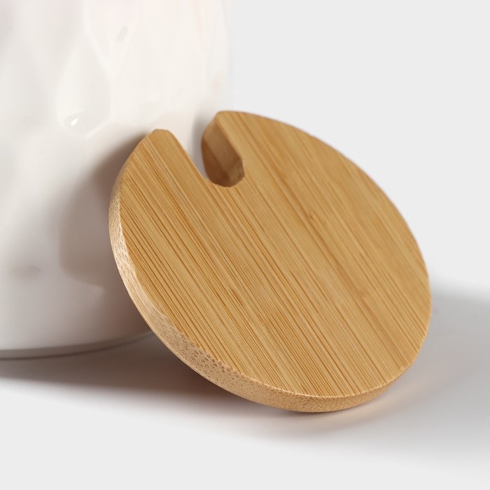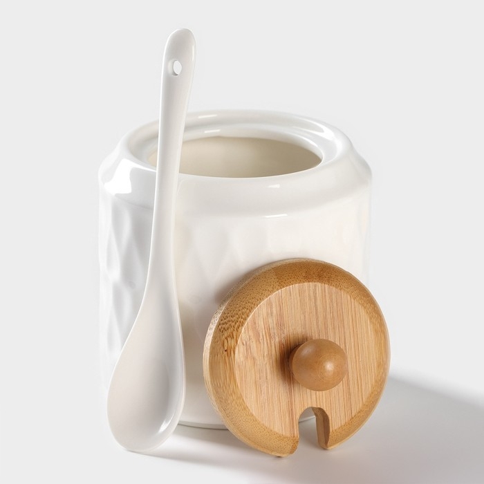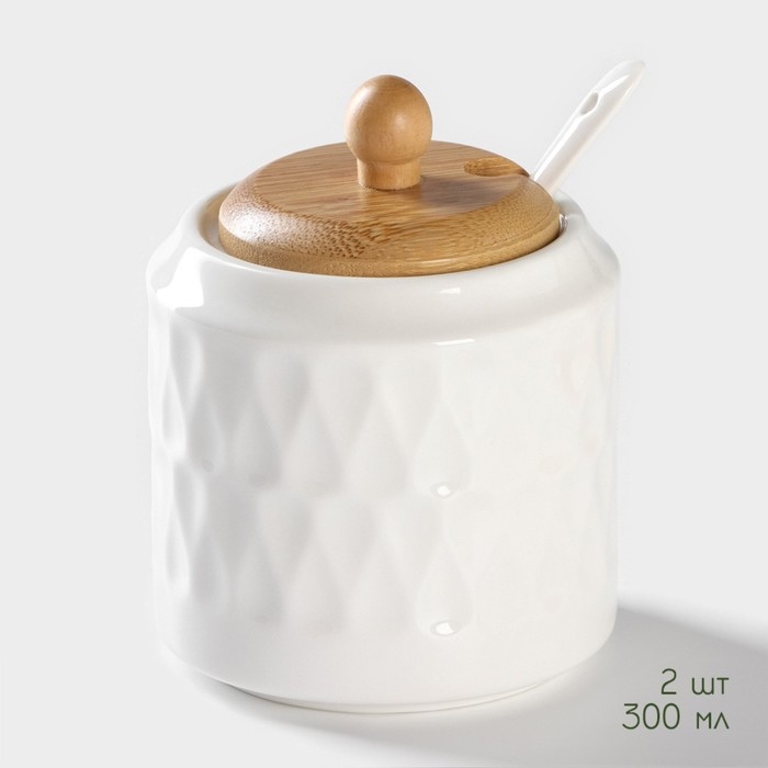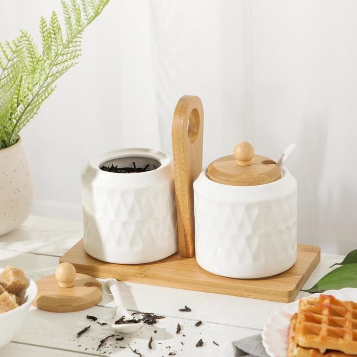 Набор банок фарфоровых для сыпучих продуктов с ложками на бамбуковой подставке BellaTenero «Герда», 2 предмета: 300 мл, цвет белый