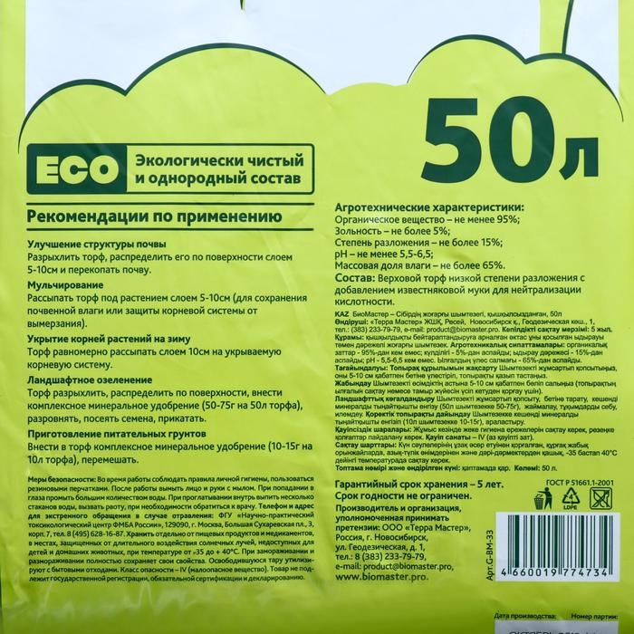 Торф раскисленный верховой сибирский "БиоМастер", 50 л