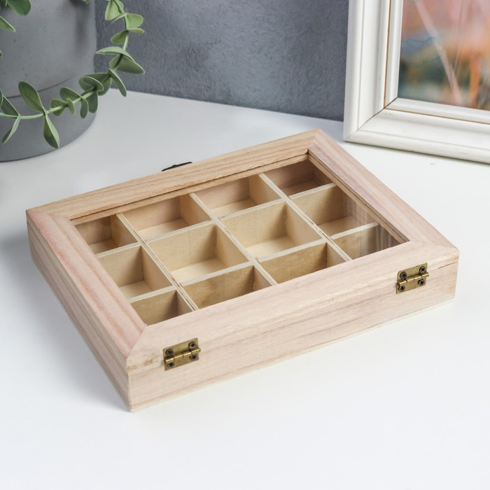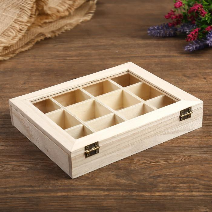 Шкатулка дер. под роспись "Прямоугольная со стеклянной вставкой" 12 отделений 3,5х19х15 см