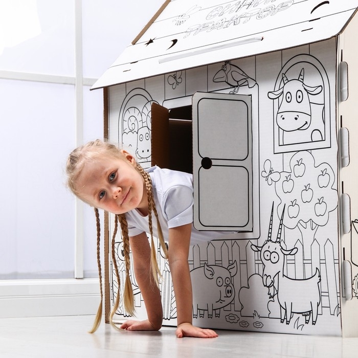 Домик из картона станет для ребёнка любимым местом для игр. Внутри малыш устроит себе уютный уголок, а снаружи раскрасит стены по собственному дизайну.
