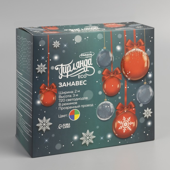 Гирлянда «Занавес» 2 × 3 м, IP20, прозрачная нить, 720 LED, свечение мульти, 8 режимов, 220 В